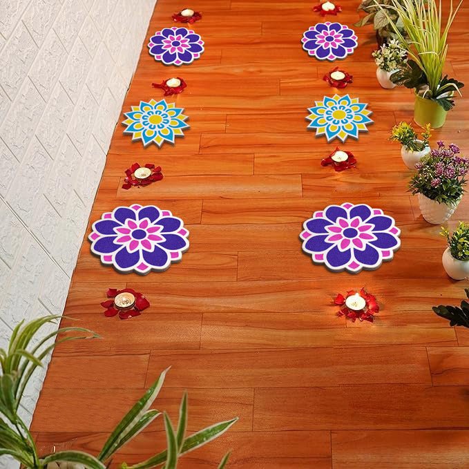 • Durable Materials: Crafted from wooden tools, the mat is built to last, ensuring you can use it for many Diwalis to come. Endless Design Possibilities: Explore an array of designs, from traditional kolam patterns to modern floral and border designs, with our versatile stencils.