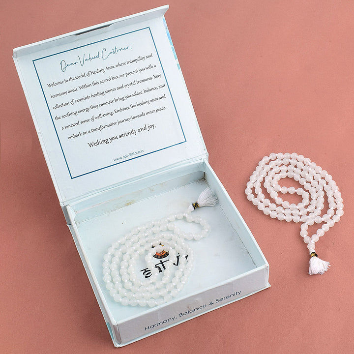 About Product: The Hakik Jap Mala (White) is made from White Agate (Scientific Name: Silicon Dioxide – SiO₂), known for its calming and harmonizing properties. This 108-bead mala is ideal for meditation, prayer, and chakra balancing. It promotes purity of thought, emotional stability, and spiritual clarity, making it a powerful tool for those seeking inner peace and mindfulness.