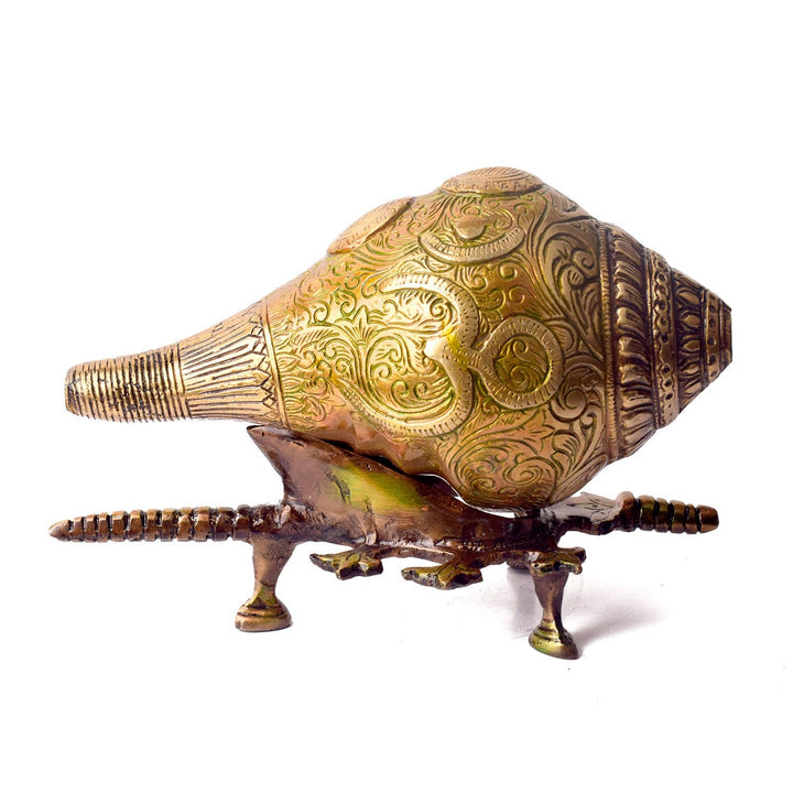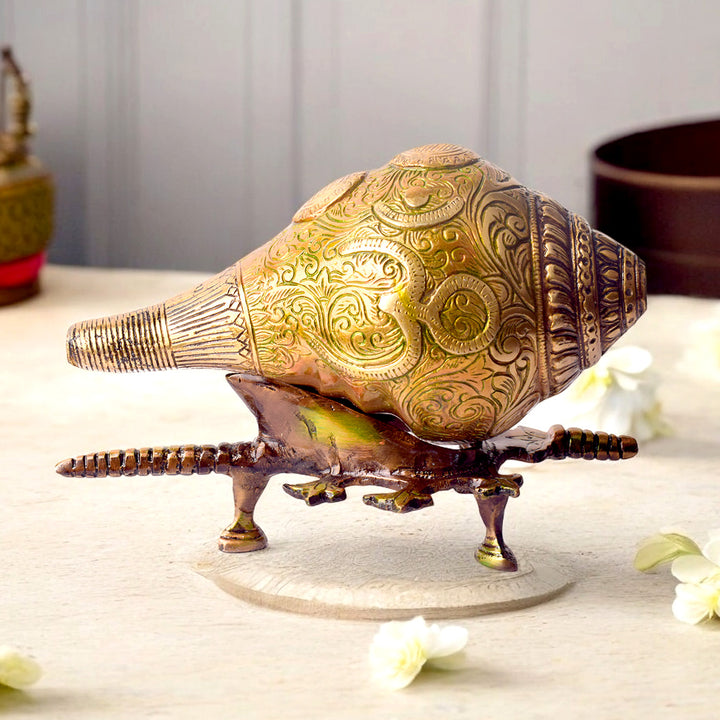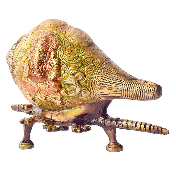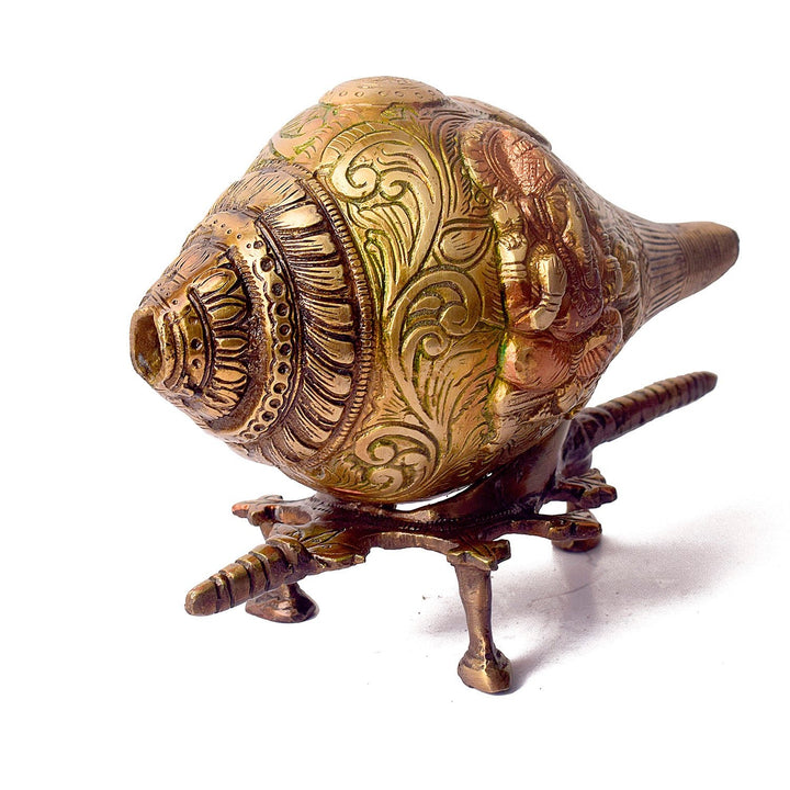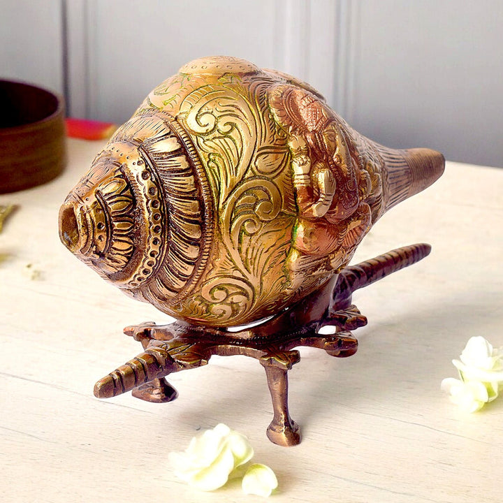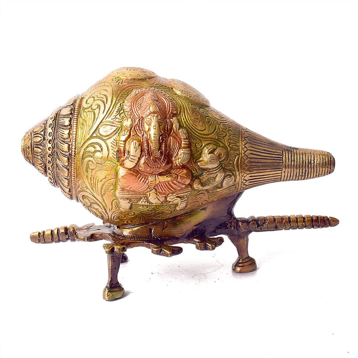 Handcrafted Indian Brass Shankh With Ganesha Engraving with Stand