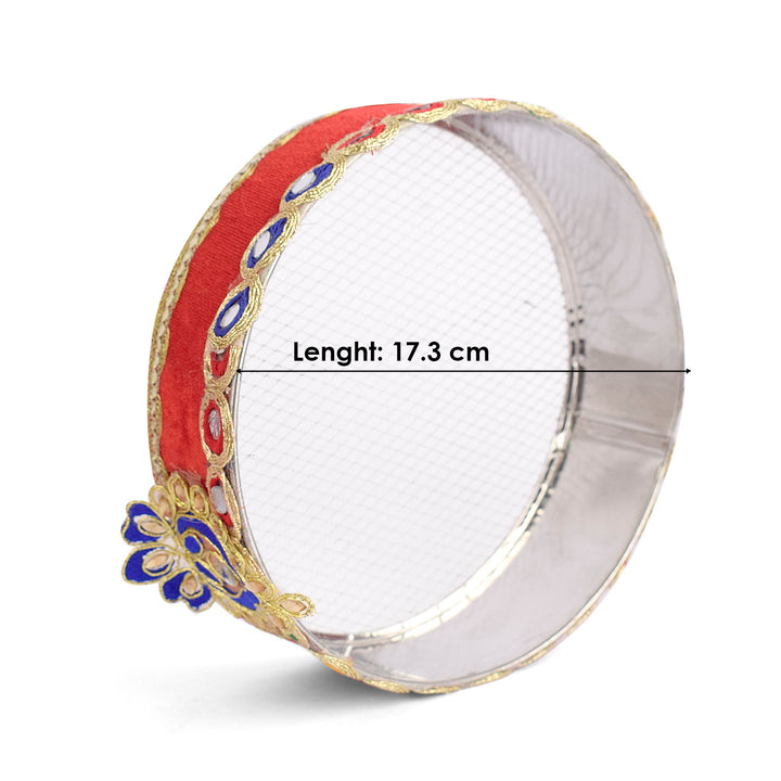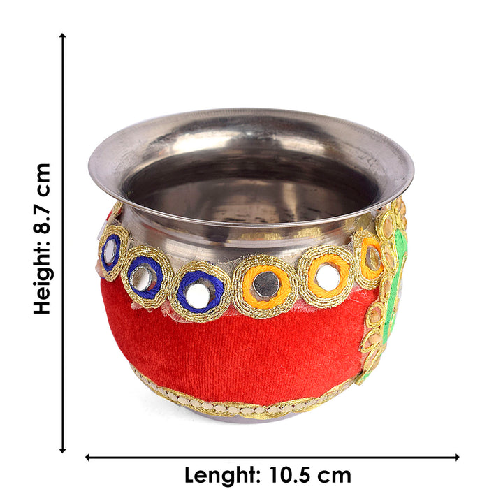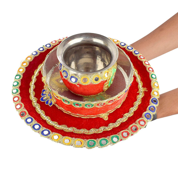 Design: Beautiful Handcrafted Designer Karwa Thali with Fabric all over the Thali and Lace Work all over the Lota and Sieve (Channi), Which makes it more Attractive.