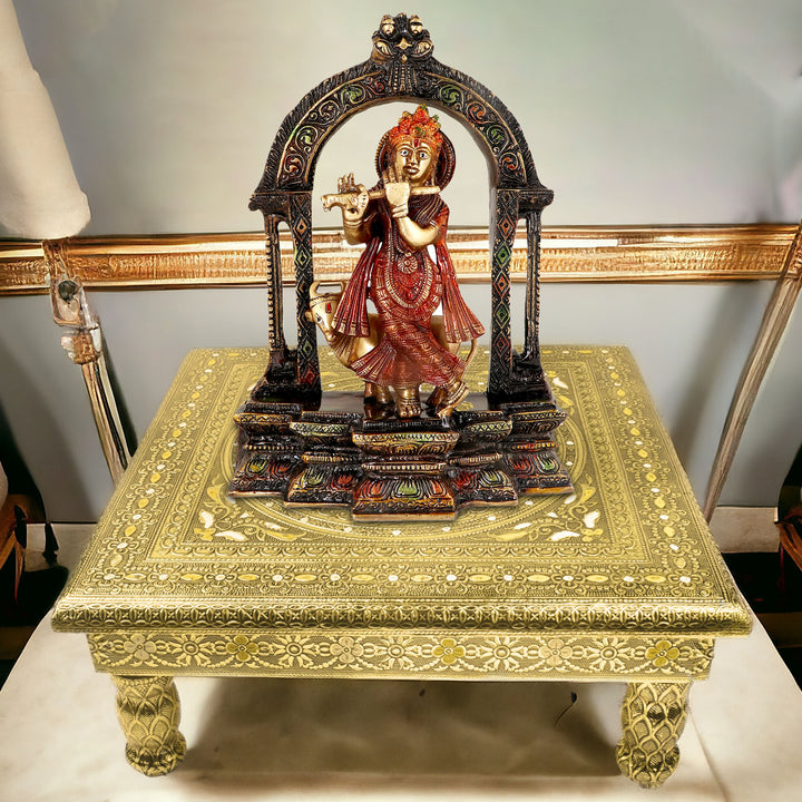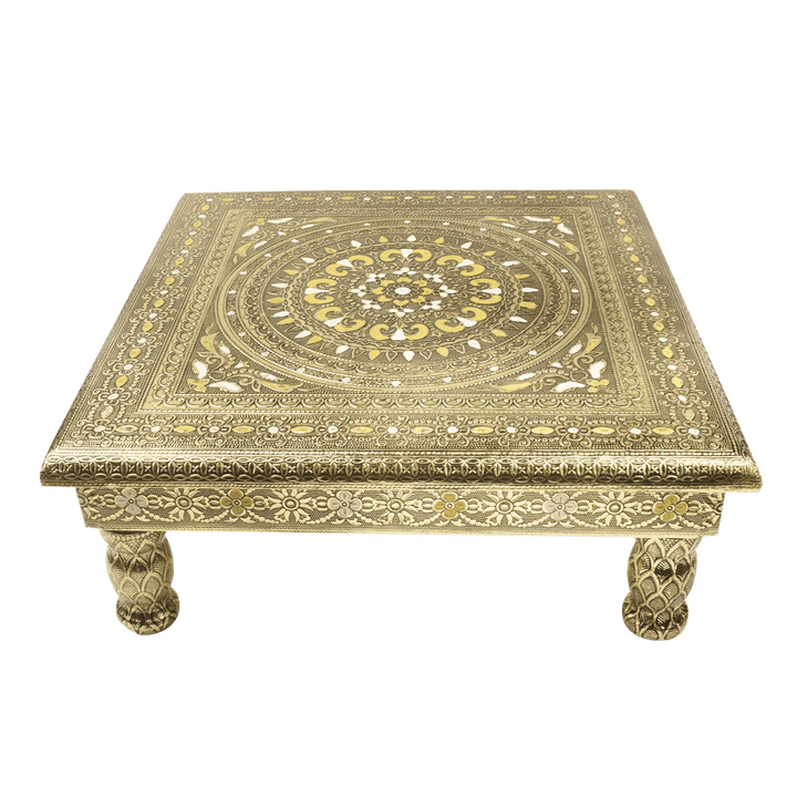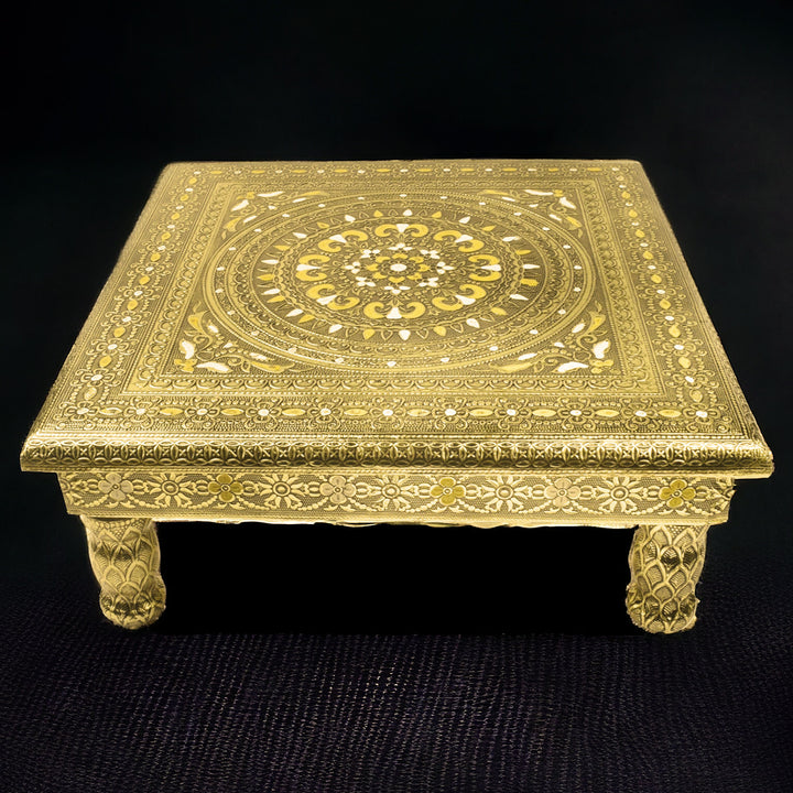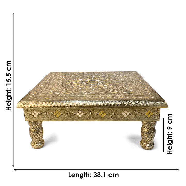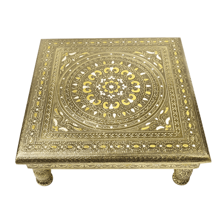 • Description: Crafted from high-quality wood, this decorative platform is adorned with vibrant Meenakari, an ancient art form that uses hand-applied enamel to create intricate and colorful patterns.The embossed patterns on the chowki make a statement of cultural elevation, offering a visual feast that harmonizes tradition and contemporary design. Its versatile use extends beyond religious ceremonies, making it a charming addition to your home decor.