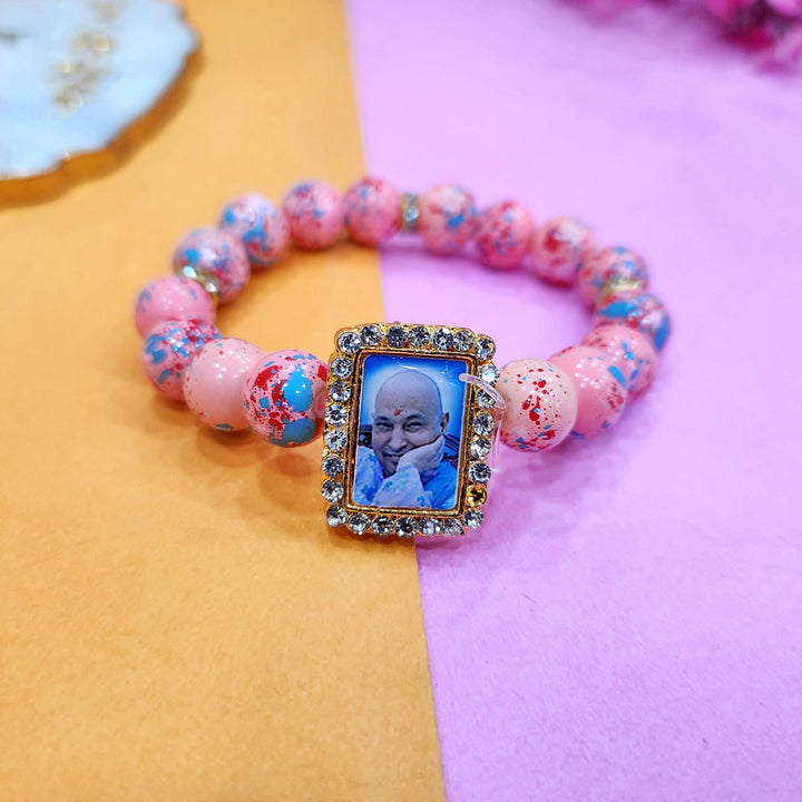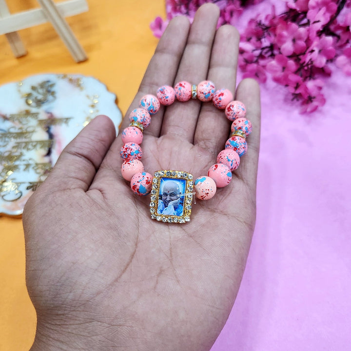 • Item Name: Peach With Multicolor Splash Round Pearl Bracelet with Jai Guruji Swaroop Handmade Bracelets for Men and Women