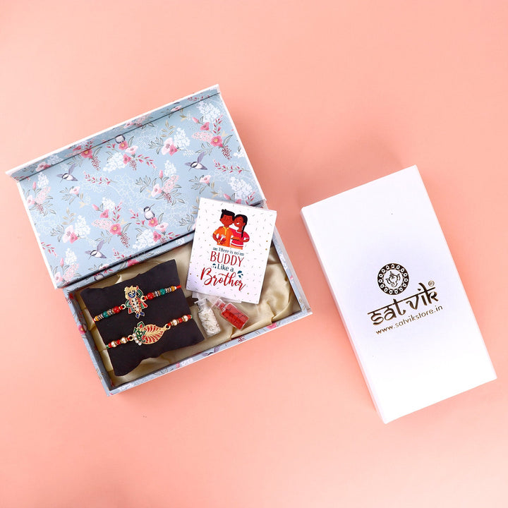 • Package: Set of 2 Bhaiya Rakhi, 1 Greeting card, 1 Roli Chawal Bottle, 1 Designer Gift Box