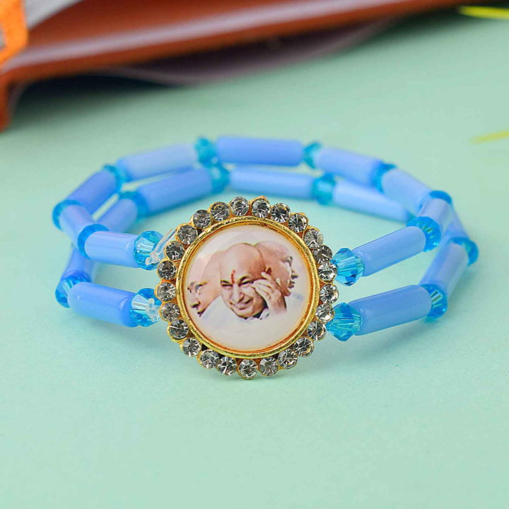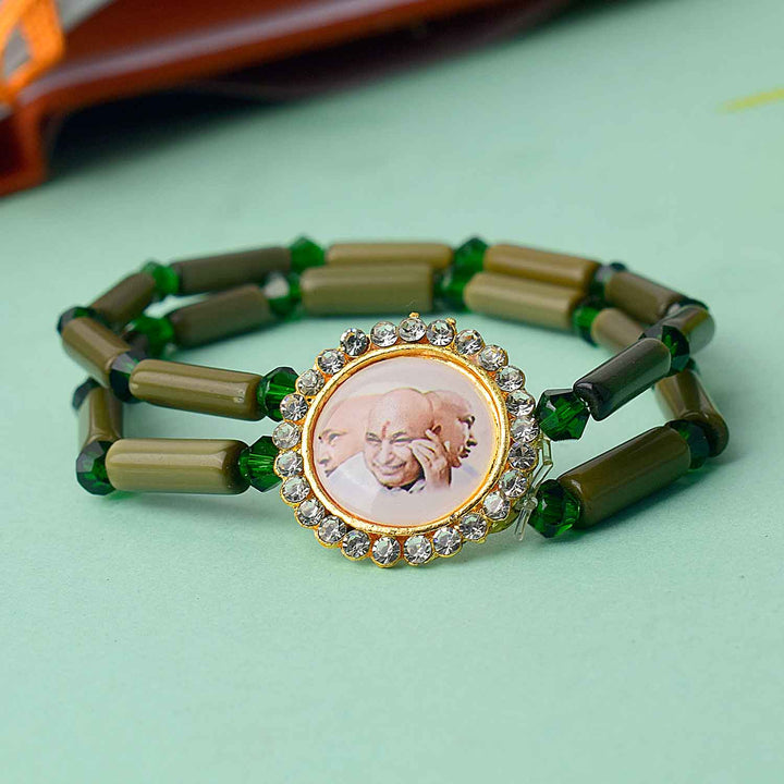 The Vibrant Long Beads Guruji Swaroop Bracelet (Assorted) showcases a striking design using elongated colorful beads that radiate spiritual vibrance and positivity. Carefully handcrafted to suit all wrist sizes, this Guruji Bracelet is ideal for spiritual practices, gifting, or as a thoughtful accessory to pair with your daily wear. Every bracelet holds an essence of devotion and charm.