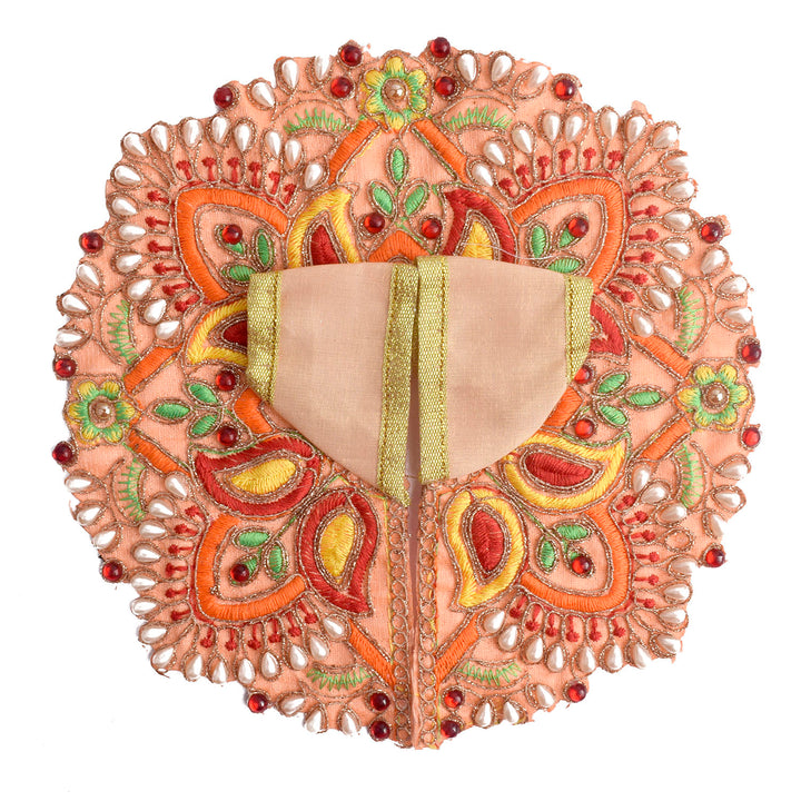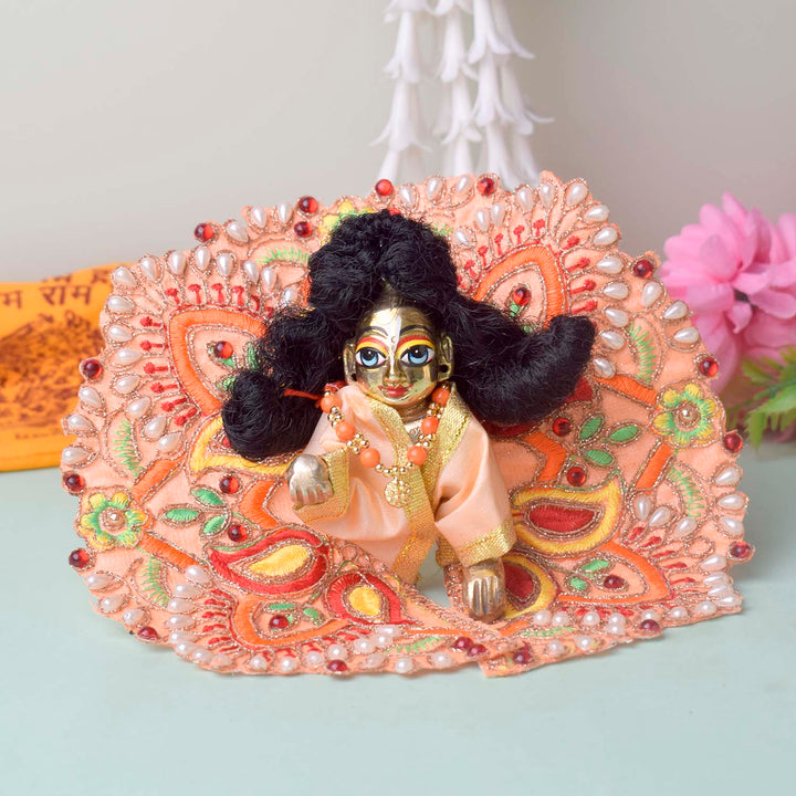 Drape your divine Laddu Gopal in vibrant elegance with this stunning orange dress set, beautifully embroidered and adorned with intricate stonework. The rich colour and meticulous detailing reflect the warmth and devotion of festive celebrations, making your deity the radiant centre of your pooja space. Perfect for Janmashtami, daily darshan, or special occasions, this exquisite dress set combines tradition and artistry to elevate Lord Krishna’s divine aura. Let every prayer be wrapped in beauty, blessings, and devotion with this graceful attire for your Laddu Gopal.