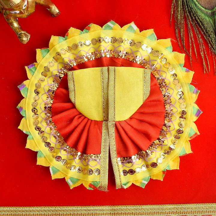 Infuse your Laddu Gopal’s attire with vibrant charm through this beautifully crafted red-yellow dress. Made from quality fabric, it blends rich hues of red and yellow, creating a lively and devotional look for your deity.