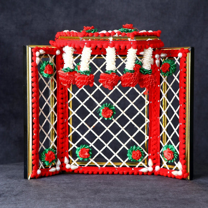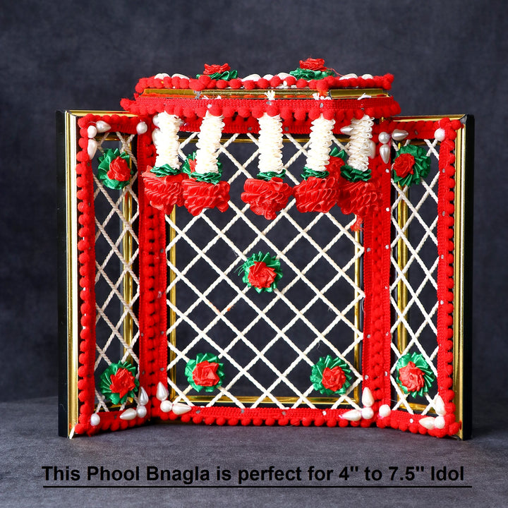Description: On significant festivals, Phool Banglas are typically used as a decoration and a backdrop for Lord Radha Krishna and Laddu Gopal and Ganpati. These phool banglas are made by the most talented artisans in West Bengal and Uttar Pradesh. On the occasions of Ganesh Chaturthi and Janmashtami, these are widely used at pandals and mandirs as well as homes and businesses.