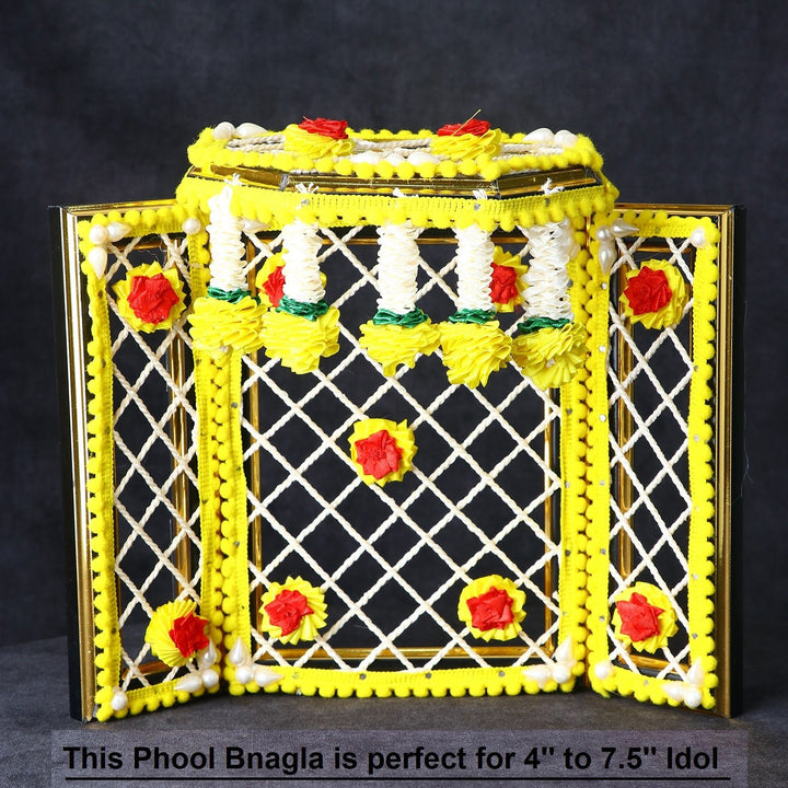 Description: On significant festivals, Phool Banglas are typically used as a decoration and a backdrop for Lord Radha Krishna and Laddu Gopal and Ganpati. These phool banglas are made by the most talented artisans in West Bengal and Uttar Pradesh. On the occasions of Ganesh Chaturthi and Janmashtami, these are widely used at pandals and mandirs as well as homes and businesses.