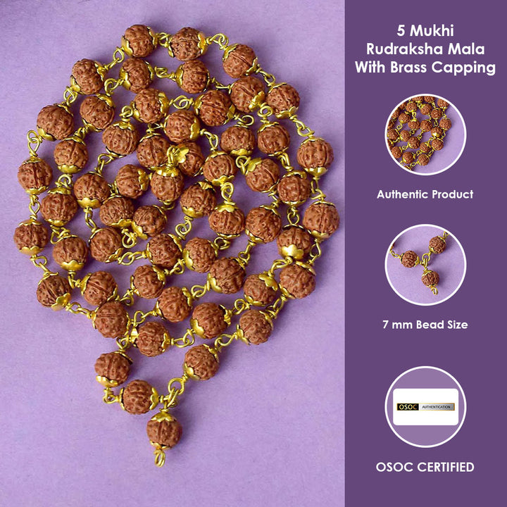 • Material:  Original 5 Face Natural Rudraksha Mala with Brass Capping Beads