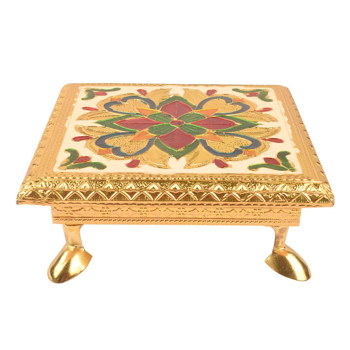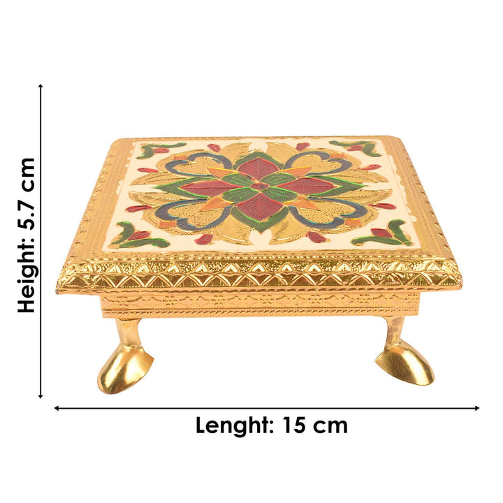 • Description: Our Meenakari Kalash Design Chowki in golden color exudes opulence, adding a touch of sophistication to your worship space or festive decor.The chowki is adorned with a symbolic Kalash design, representing prosperity and auspicious beginnings, making it a meaningful addition to religious ceremonies, weddings, and celebrations. the chowki offers a compact yet sturdy platform for religious idols, ensuring a stable base for your worship rituals.