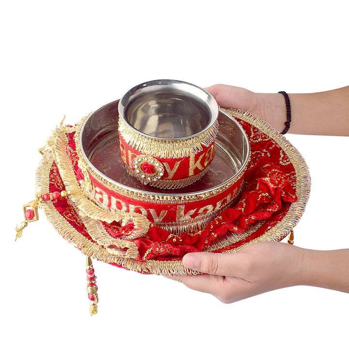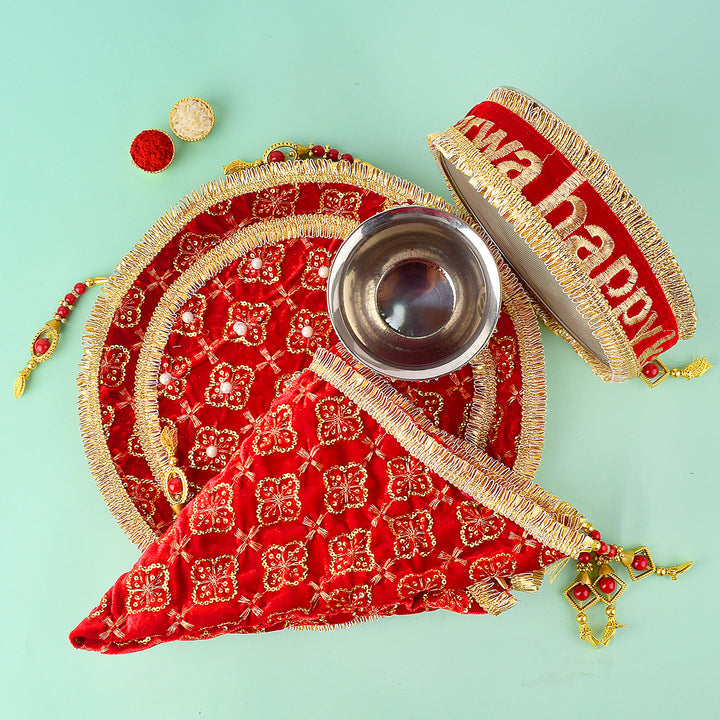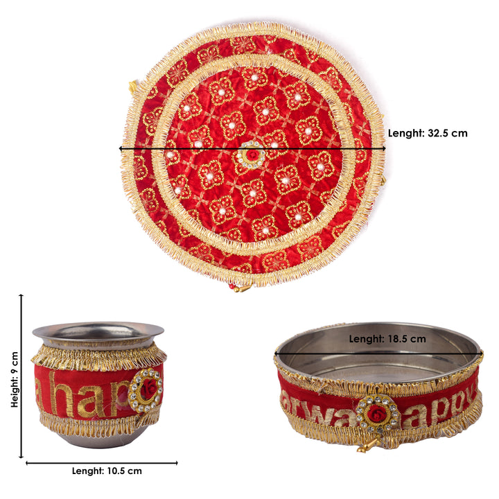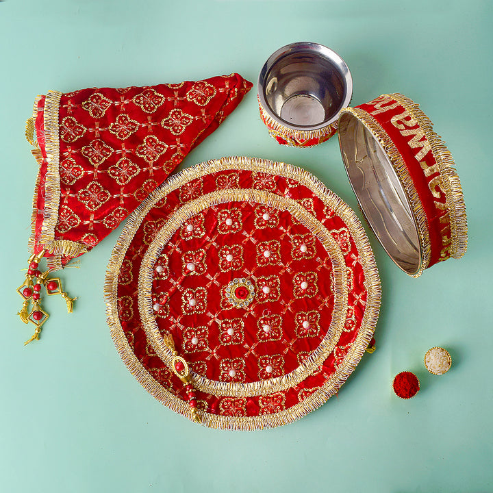 Item Name: 11 Pc Red Embroidery Karwa Chauth Thali Set with Cover – Complete Puja Kit