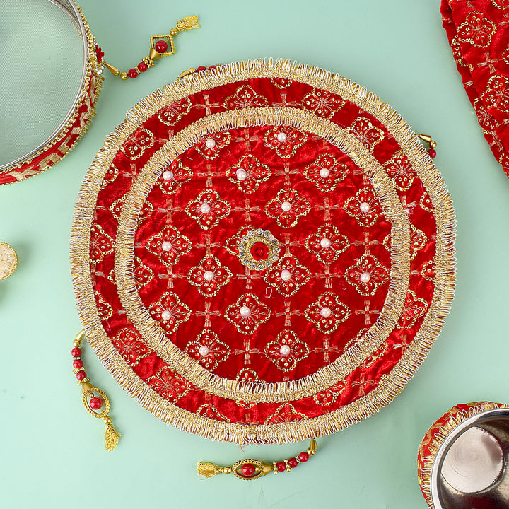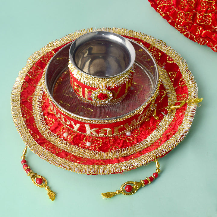 Shop Now Red Embroidery Karwa Chauth Thali Set 11 Pc | Satvikworld.com