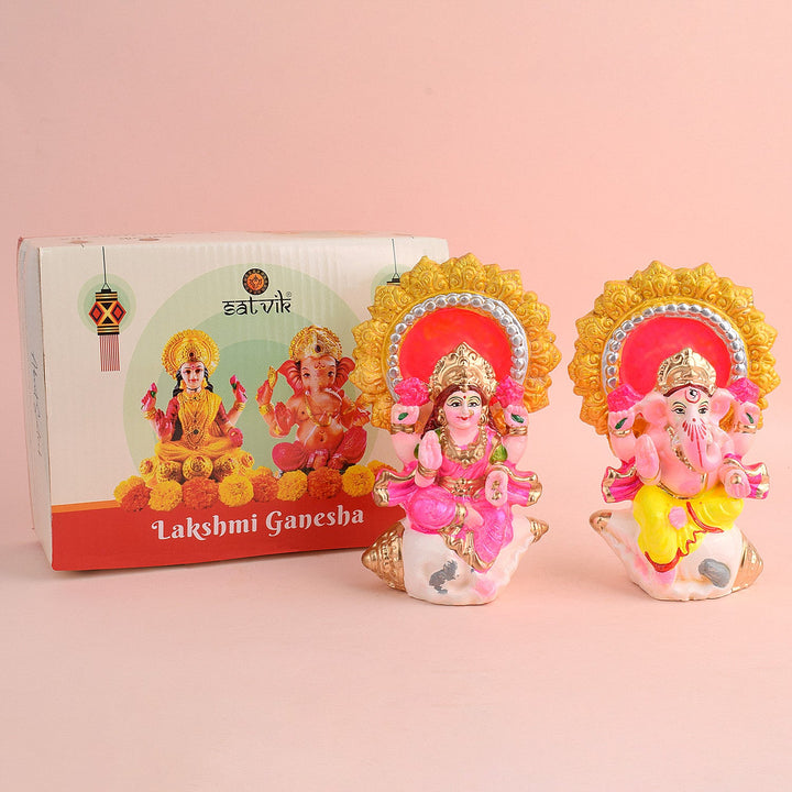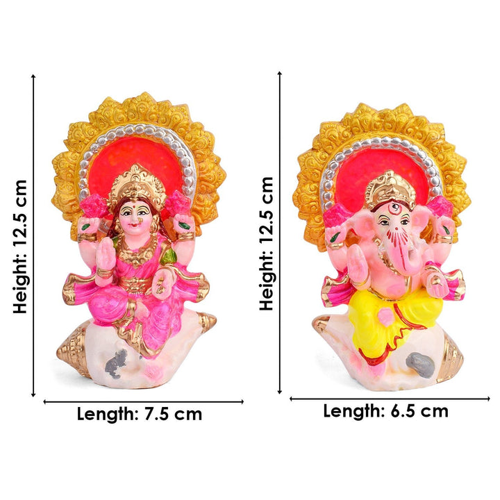 • Product Details: Material: Clay Dimensions: Ganesha: Height: 12.5cm, Length: 6.5cm, Width: 5.7cm, Laxmi: Height: 12.5cm, Length: 7.5cm, Width: 5.7cm, Total weight: 465gram, Finish Type: Glossy.