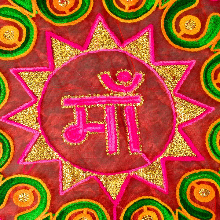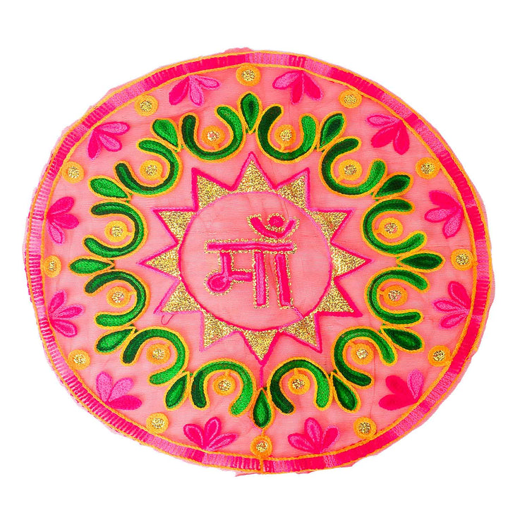 Pink Ma Thal Posh | Organza Thali Cover | Jai Mata Di Pooja Cloth | Pink Pooja Accessories | Festival Aarti Thalposh | Sacred Cloth for Pooja | Navratri Essentials | Pink Decorative Cloth | Worship Accessories | Embroidered Thali Cover