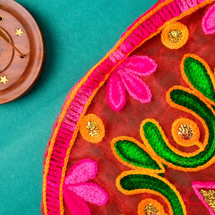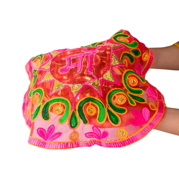 Grace your spiritual ceremonies with this stunning pink Ma Thal Posh / Thali Cover crafted from soft organza. Adorned with elegant embroidery, it symbolizes devotion and is a charming addition to your sacred space. This piece is ideal for traditional rituals like Navratri, Durga Puja, and daily pooja, making every offering more divine.