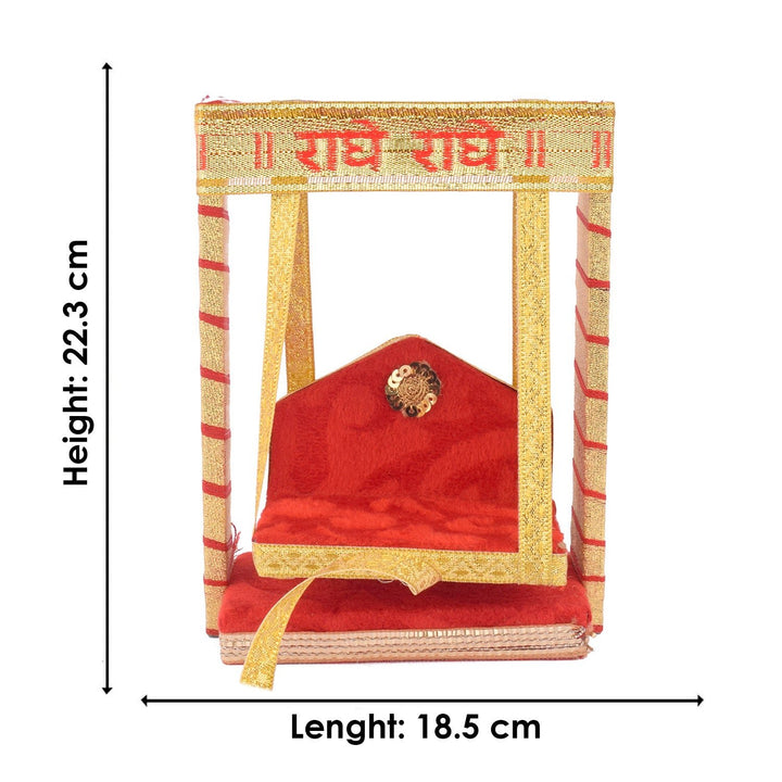 Celebrate the divine love of Radha and Krishna with this Blessed Laddu Gopal Jhula, adorned with beautiful Radhe Radhe print. Made with a sturdy wooden frame and colorful fabric details, this swing brings spiritual charm and vibrant devotion to your pooja space.