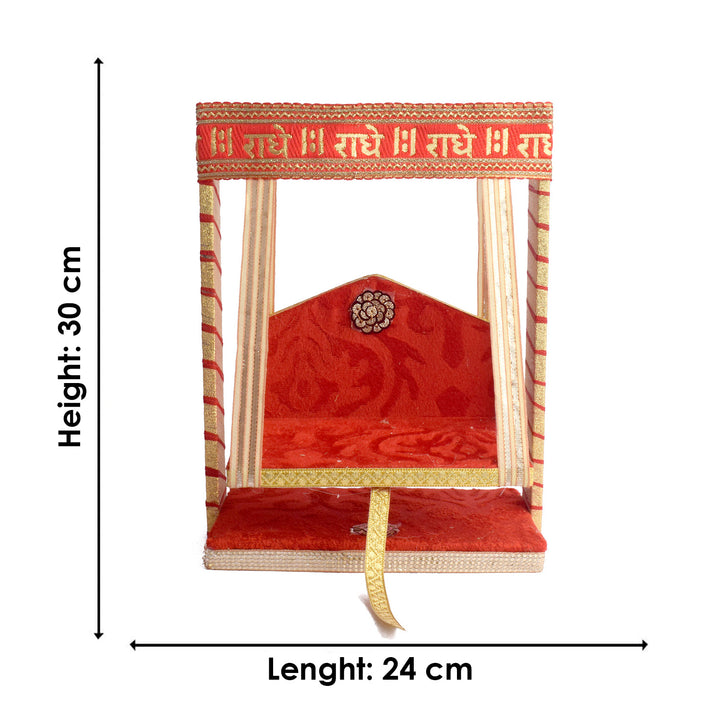 radhe radhe printed jhula | laddu gopal jhula wooden | krishna swing for janmashtami | colorful gopal jhula | pooja swing with radha krishna print | bal gopal cradle | radhe radhe pooja accessories | home temple laddu gopal swing | satvikstore deity decor
