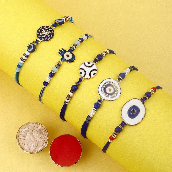 • Item Name: Blessings of Love Evil Eye Rakhi Set of 5