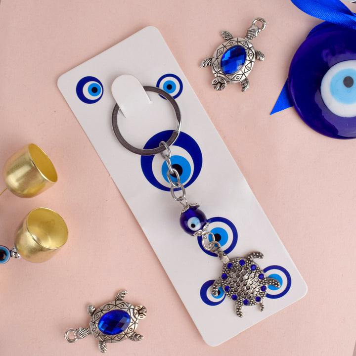 Blue Bead Silver Evil Eye Turtle Keychain | Buy Online | Satvikworld.com
