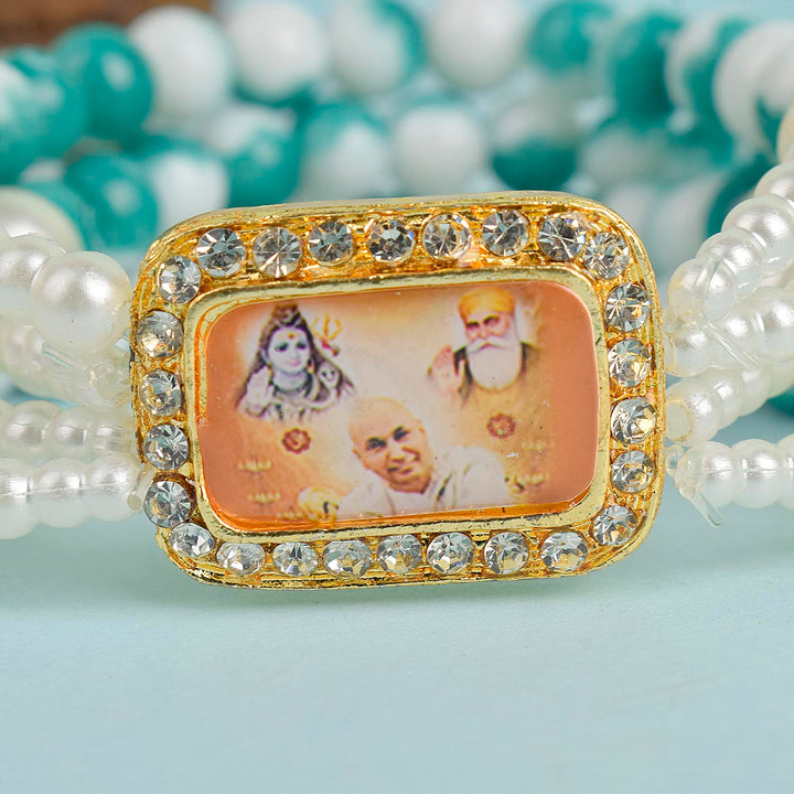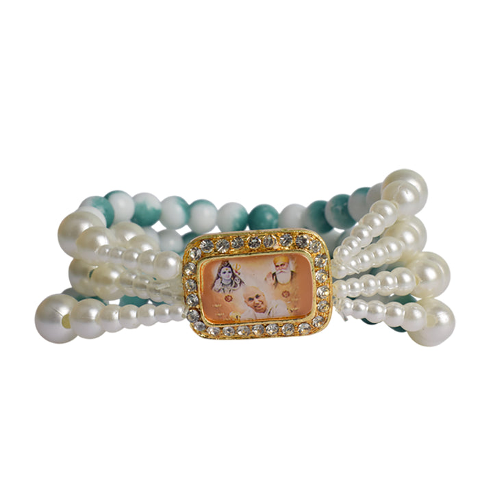 bluish green guruji bracelet | marble beads guruji bracelet | four layer spiritual bracelet | elegant guruji swaroop bracelet | divine bluish green bracelet | white marble devotional bracelet | jai guruji bracelet | spiritual jewellery india | unique colour bracelet | pooja return gift for women | stylish spiritual bracelet | meditation accessories | guruji bracelet india | graceful spiritual jewellery | indian religious bracelet | satvikworld spiritual products | guruji bracelet online india | pooja items