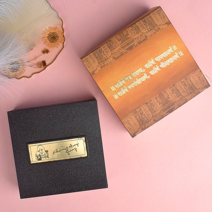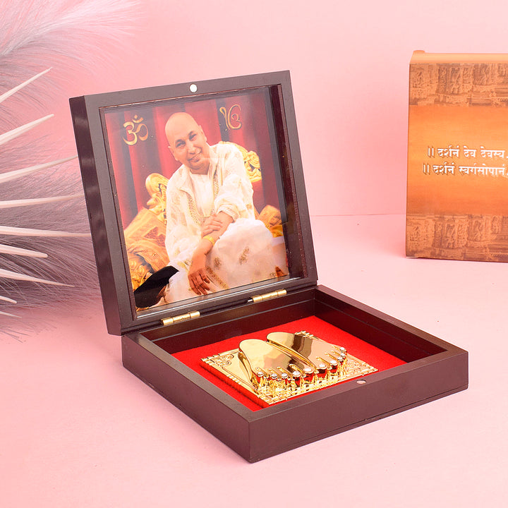About Product:  This box has a Gold Plated Charan paduka. It Consist Guruji Swaroop. Guruji Signature over the top of the Wooden Box. It also Called Devotional Prayer Box. It has Beautiful Gift Packing all around the box so that this can be perfect gifting Idea for any Religious Occasions.