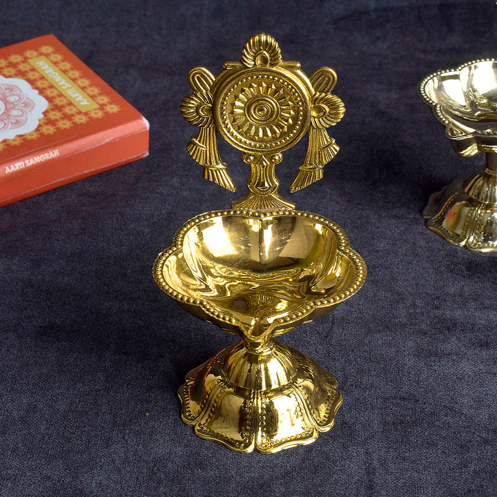 Chakra Brass Diya | Designer Brass Oil Lamp | Traditional Chakra Diya | Brass Puja Lamp | Festival Diya Decoration | Indian Brass Diya | Chakra Pattern Diya | Brass Spiritual Decor | Decorative Brass Diya |