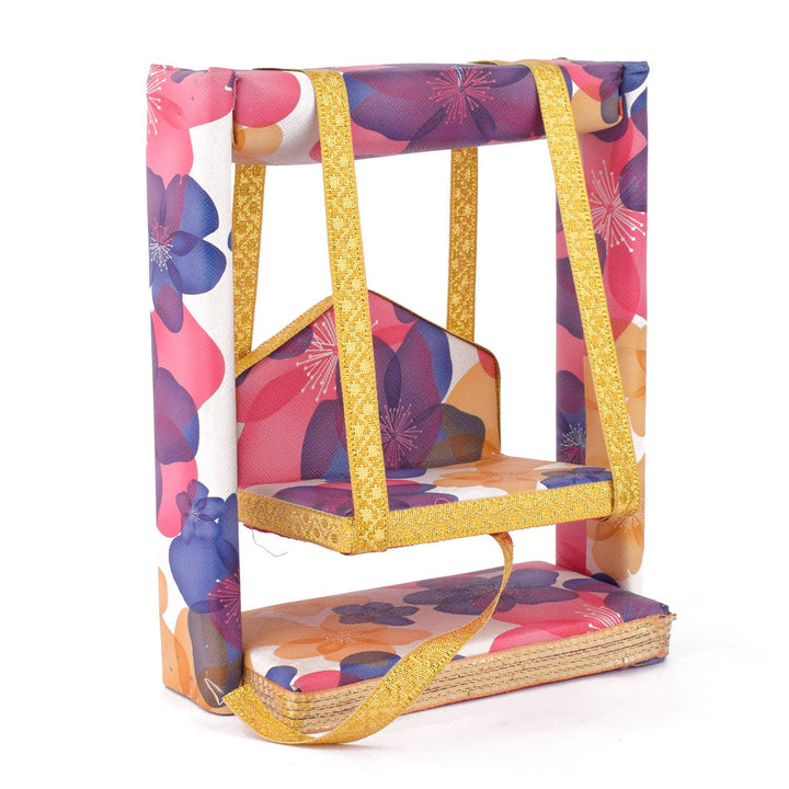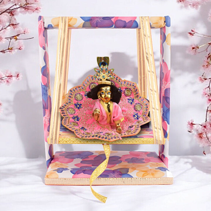 laddu gopal jhula | divine gopal swing | floral printed laddu gopal jhula | krishna swing for janmashtami | decorative jhula for bal gopal | gopal swing with floral print | laddu gopal pooja jhula | wooden jhula for kanha ji | bal gopal swing for temple | designer jhula for laddu gopal