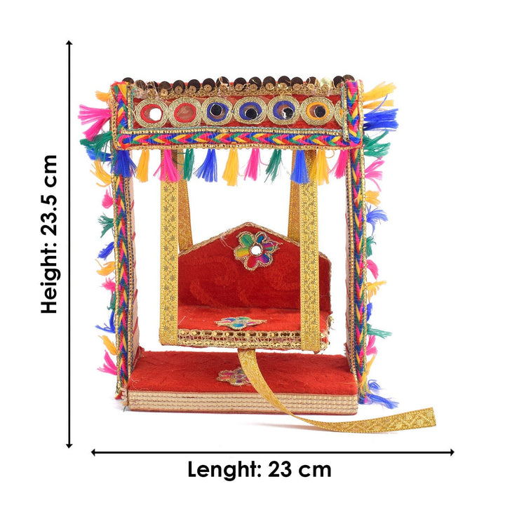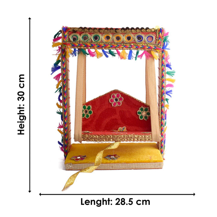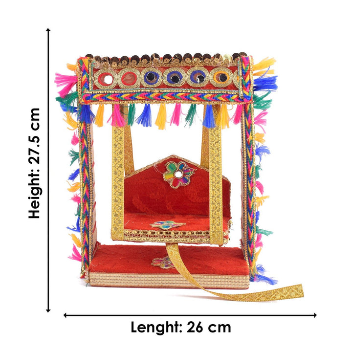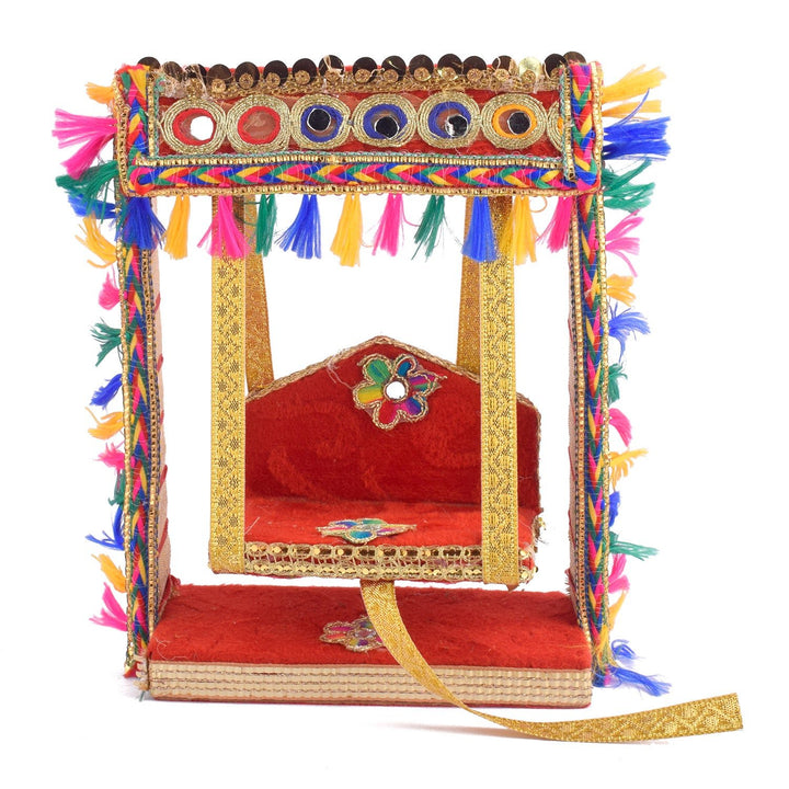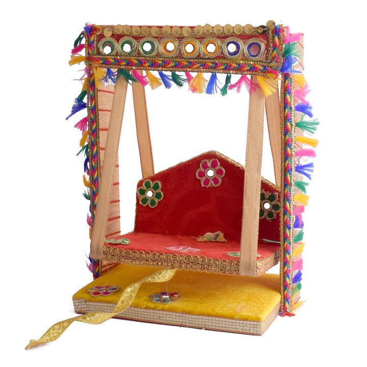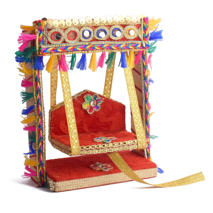 Add sparkle to your mandir with our Elegant Mirror Stone Jhula for Laddu Gopal, a stunning handcrafted swing combining traditional beauty with eye-catching embellishments. This wooden jhula is detailed with mirror stones and rich fabric, creating a sacred yet decorative touch for your Laddu Gopal Ji or Ganpati.
