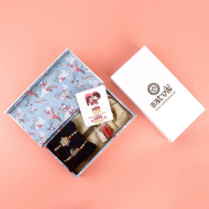 • About Product: Elevate your Raksha Bandhan celebrations with our exquisite Premium Rakhi Gift Box. Carefully curated, this box offers a collection of handpicked treasures that embody love and affection. From beautifully crafted rakhis symbolizing the bond between siblings to thoughtfully curated gifts, it's a testament to the art of giving. The box itself exudes sophistication with its luxurious design, making it a cherished gift. Each item within evokes joy and gratitude, creating lasting memories. Celebrate the bond of love and strengthen relationships with this remarkable gift box. Let every moment be filled with appreciation as you present this exquisite collection to your loved ones. Please note that the contents may vary, ensuring a personalized and premium gifting experience. Elevate your Raksha Bandhan with our Premium Rakhi Gift Box.