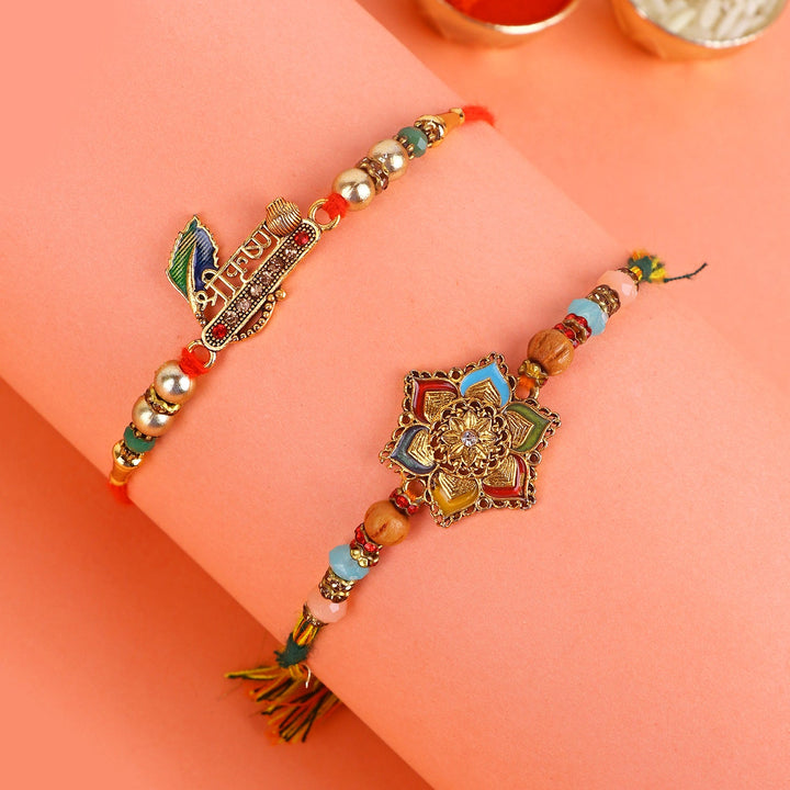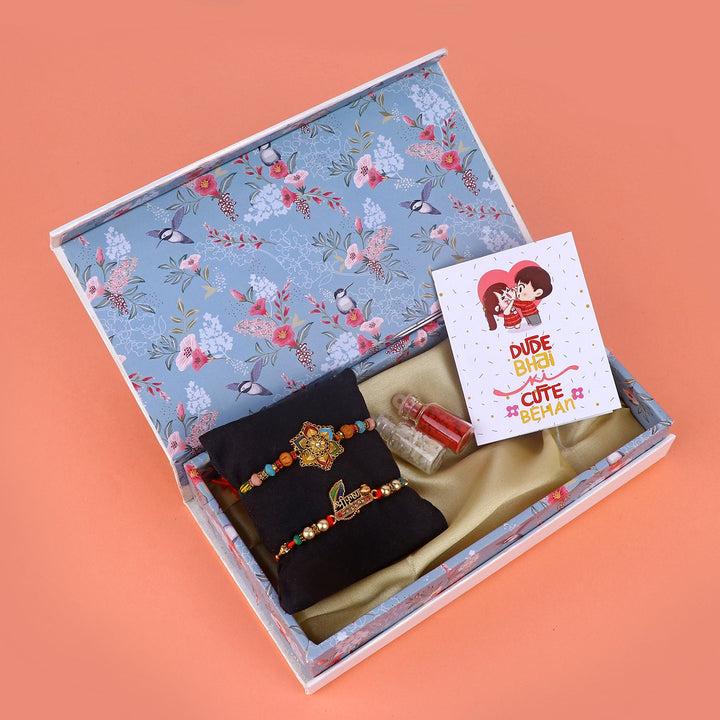 • Package: Set of 2 Bhaiya Rakhi, 1 Greeting card, 1 Roli Chawal Bottle, 1 Designer Gift Box