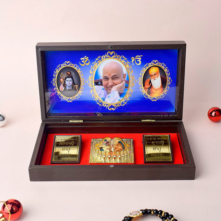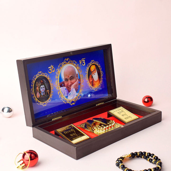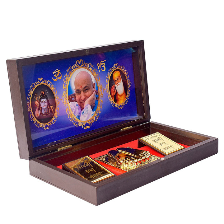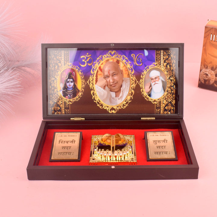 About Product:  This box has a Gold Plated Charan paduka in the middle both side of paduka there is engraved "Guruji Sada Sahay" and "Shiv ji Sada Sahay" in beautiful golden plated plate. It Consist Guruji Swaroop with Shivji and waheguru. Guruji Signature over the top of the Wooden Box. It also Called Devotional Prayer Box. It has Beautiful Gift Packing all around the box so that this can be perfect gifting Idea for any Religious Occasions.