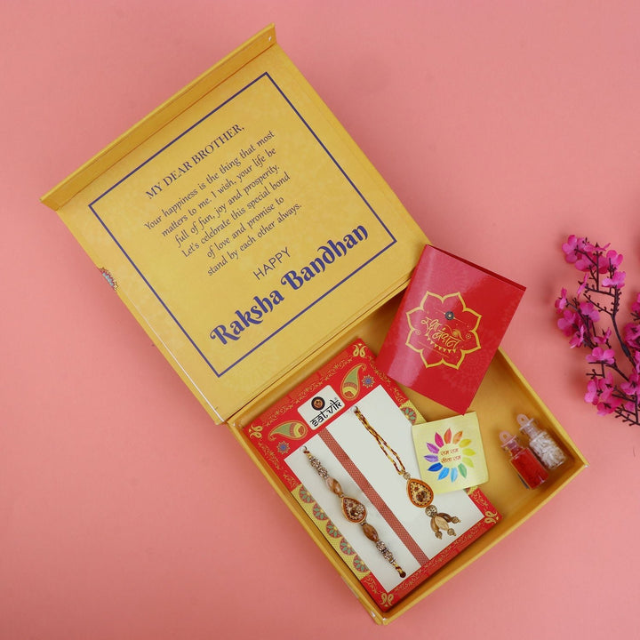 • Package: Set of 2 Bhaiya Rakhi, 1 Greeting card, 1 Roli Chawal Bottle, 1 Designer Gift Box