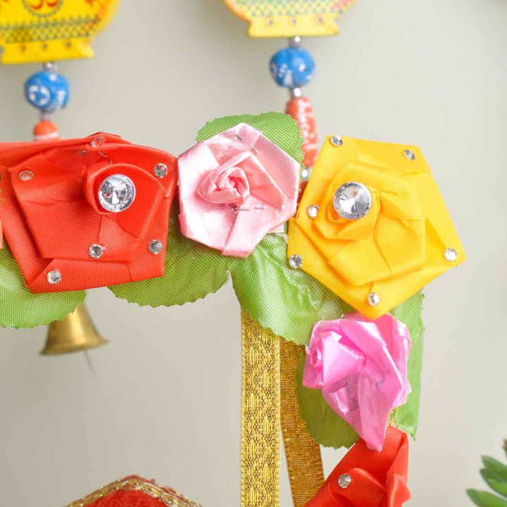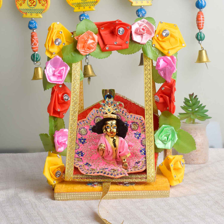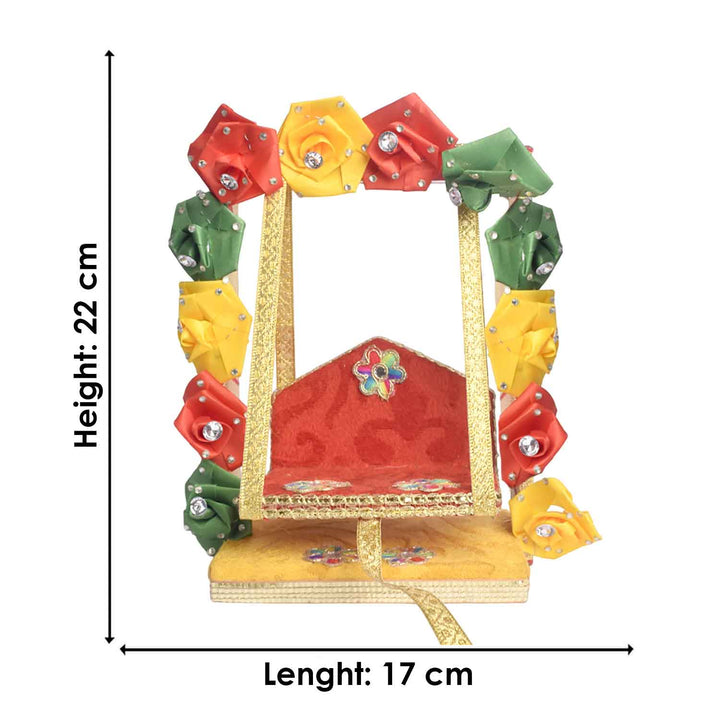 • Note: Features assorted floral designs—each piece uniquely adorned with charming faux flowers, making every jhula a distinctive expression of divine beauty.