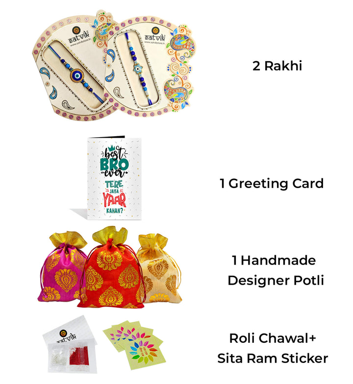In this Box you will get Evil Eye and Star of David Evil Eye, Potli, Roli Chawal, Greeting Card, Holy Soun (Ram Sita Stickers). Send your Love to your brother with this Rakhi Set. It will Make Rakshabandan Memorable.