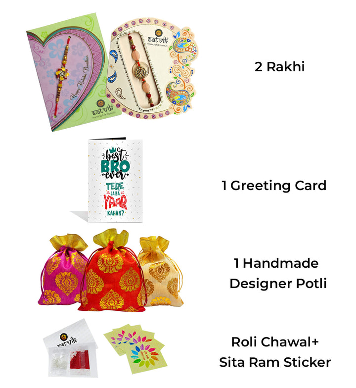 • Package: Set of 2 Rakhi with Tilak set and Holy Soun ( Ram Sita Stickers). All Rakhi are same as shown in picture.