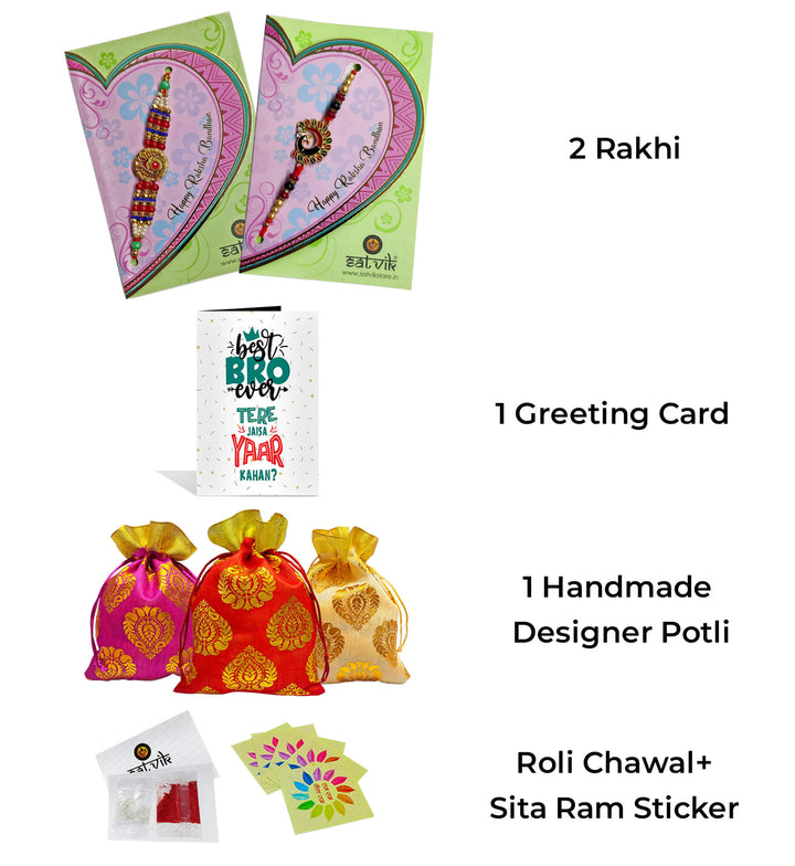 In this Box you will get  Peacock and Multibeads Rakhi Potli, Roli Chawal, Greeting Card, Holy Soun (Ram Sita Stickers). Send your Love to your brother with this Rakhi Set. It will Make Rakshabandan Memorable.