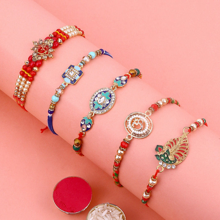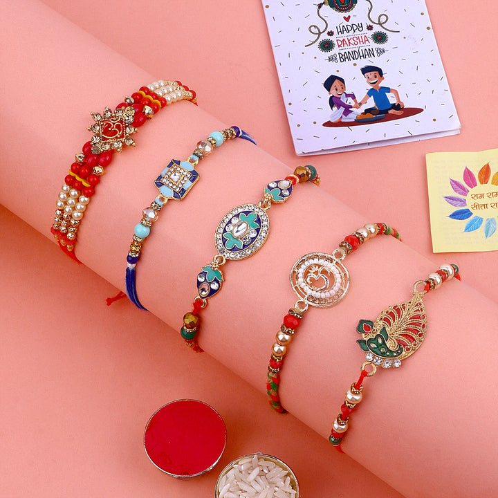 • About Product: Satvik Store Introducing this Assorted Designer Rakhi Set of 5 to make this occasion special. Each rakhi in this collection is a work of art, painstakingly made with elaborate designs and embellished with colorful ornaments. These designer rakhis are a fusion of tradition and modern elegance, with shimmering strands and brilliant stones. Each of the set's rakhis is a special representation of love and protection with a variety of patterns and motifs. Allow your brothers to experience the comfort of their affection by surprising them with this type of lovely collection. Making your celebration of Raksha Bandhan a special occasion by celebrating their bond via our Colourful Designer Rakhi Set of 5.