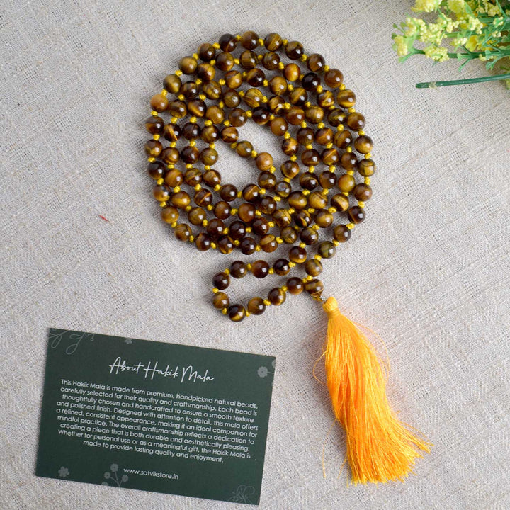 • Item Name: Tiger Eye Hakik Mala (108 Beads) – A Stone of Strength & Protection