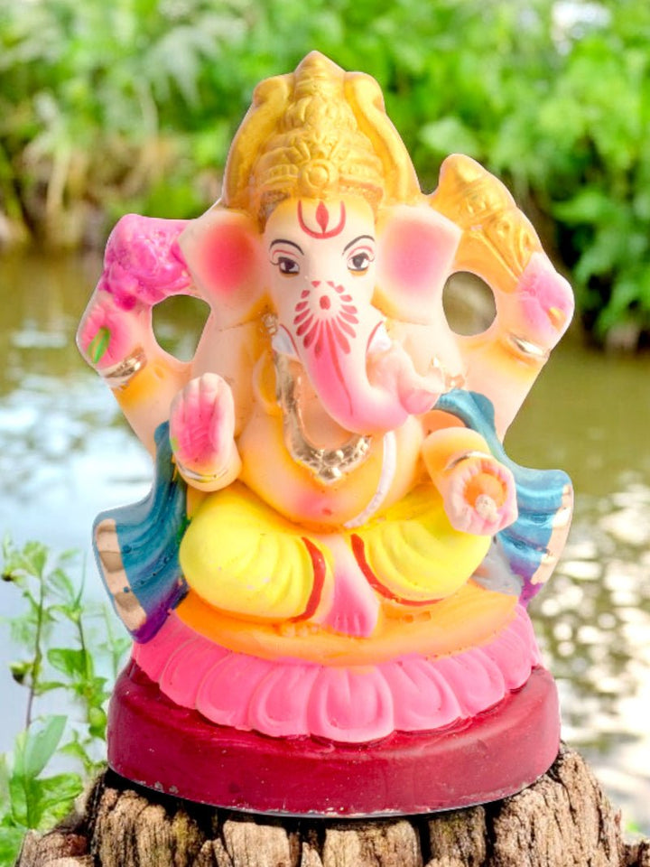 Eco Friendly Ganesha statues are made of 100% biodegradable and eco-friendly material by using Shadu Mati Clay Mitti, which dissolves easily in water. The colours used are also natural, and they decompose and dissolve in water easily. Although they have been made all across India, West Bengal and Maharashtra often employ skilled artisans to make them.