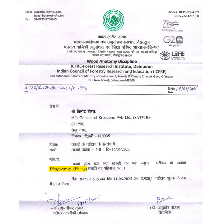 • Tested by : Authenticity certified by Central Wood Testing Laboratory The Rubber Board (Ministry of Commerce & Industry Govt. of India) and ICRE – Forest Research Institute, Dehradun – ensuring genuine Karungali wood quality.