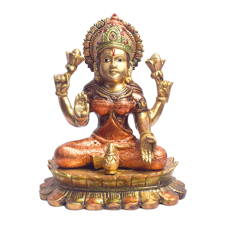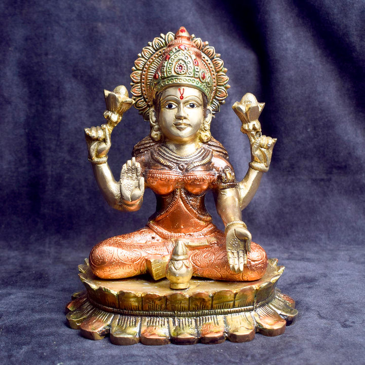 • Lakshmi, the Goddess of wealth, prosperity, and fortune, is typically depicted with her graceful and serene posture, holding lotus flowers and gold coins, symbolizing abundance and blessings.