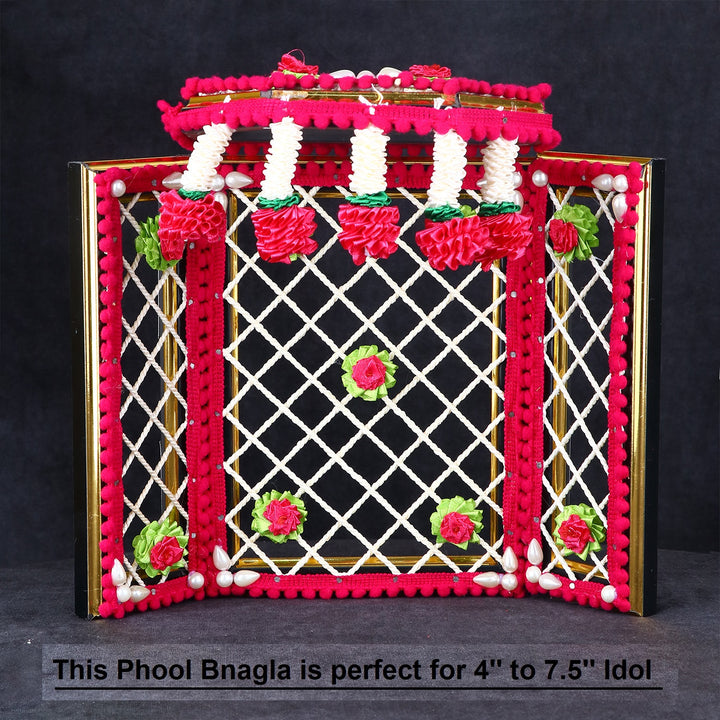 Description: On significant festivals, Phool Banglas are typically used as a decoration and a backdrop for Lord Radha Krishna and Laddu Gopal and Ganpati. These phool banglas are made by the most talented artisans in West Bengal and Uttar Pradesh. On the occasions of Ganesh Chaturthi and Janmashtami, these are widely used at pandals and mandirs as well as homes and businesses.