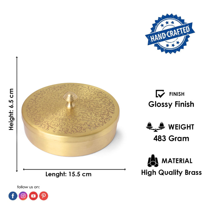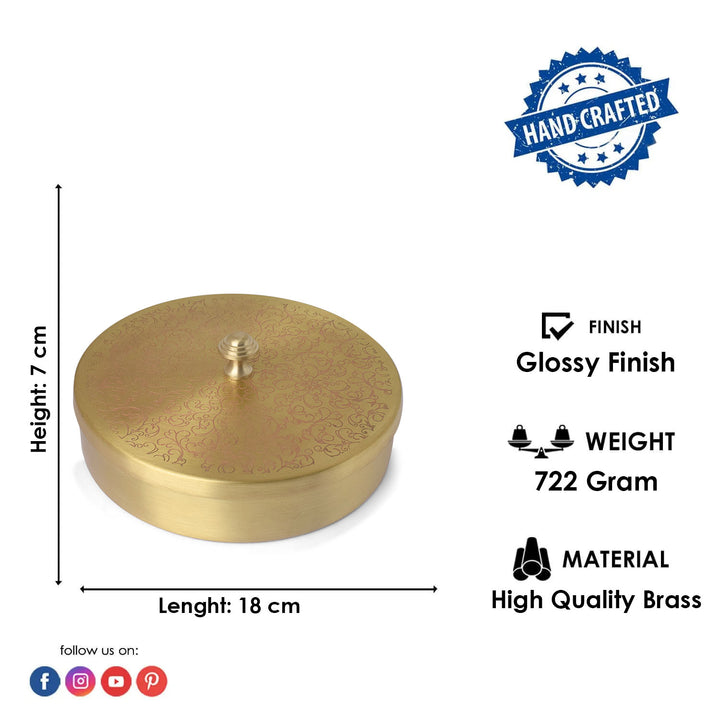 Elevate your Pooja room with this exquisite spice storage container featuring 7 compartments, crafted in pure brass. The traditional Indian Brass smithing techniques, coupled with intricate etching, add a touch of elegance. Each Brass box is handcrafted, ensuring a unique and distinct character with minor variations, making it a truly special addition to your sacred space. Upgrade your Pooja Ghar with this artisanal brass piece, blending functionality with timeless design.