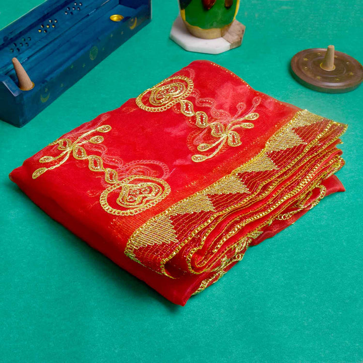 Red Sacred Puja Mata Ki Chunni | Religious Ceremony Chunri Red | Devotional Mata Chunri Red | Traditional Pooja Cloth Red | Spiritual Worship Shawl Red | Pooja Decoration Cloth Red | Hindu Festival Chunri Red | Devotional Offering Cloth