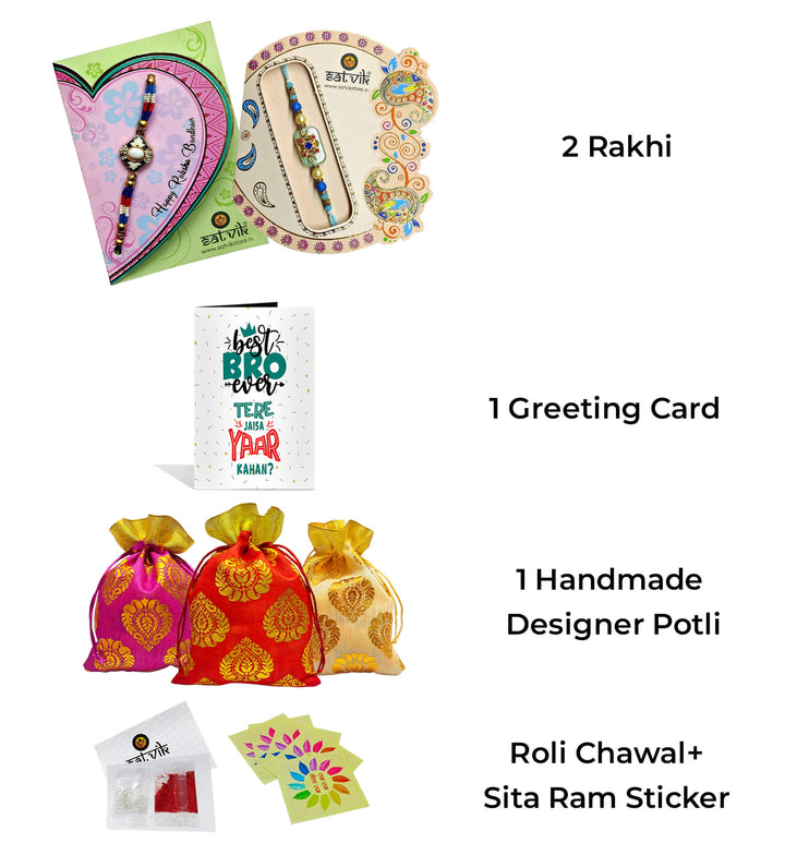 In this package you will receive 2 PC Designer Rakhies, Potli,, Greeting Card, Roli Chawal And Holy Soun Stickers (Ram Sita Stickers).