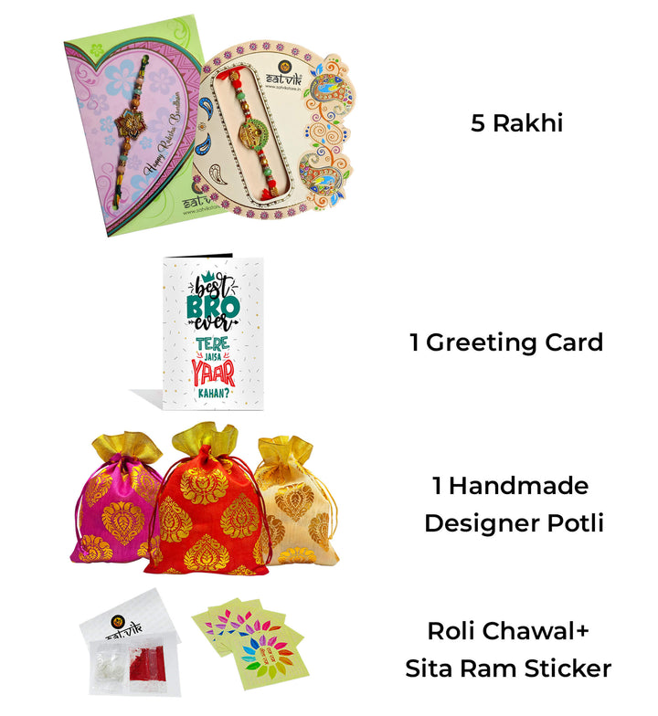 In this you will receive Colorful Rakhi, Radhey Krishna Rakhi with Tassle along with Greeting Card, Roli Chawal, Holy soun stickers, Potli.