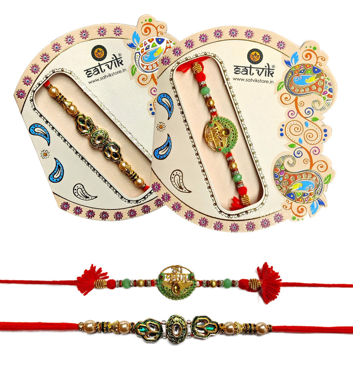 Satvik Set Of 2 Radhey Krishna And Green Stone Rakhi – Satvikworld.com