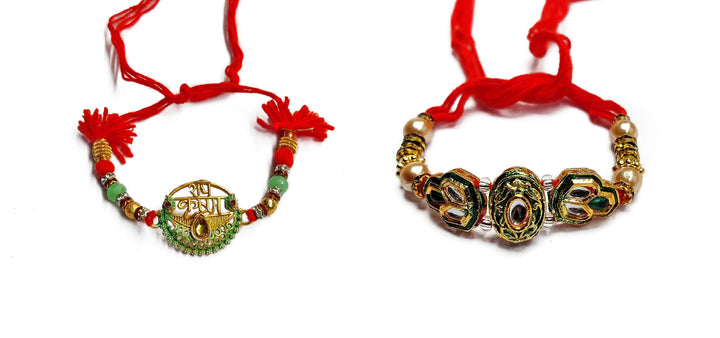 Satvik Set Of 2 Radhey Krishna And Green Stone Rakhi