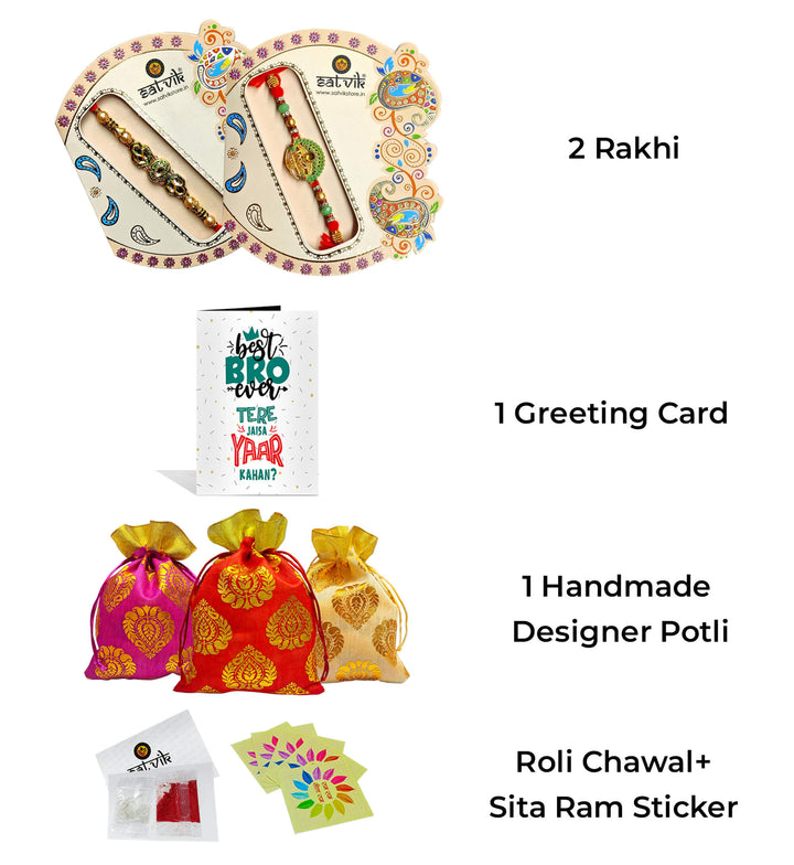 • Package: Set of 2 Rakhi with Tilak set ( Roli Chawal ) and Holy Soun ( Ram Sita Stickers).Greeting Card, Holy Soun Stickers