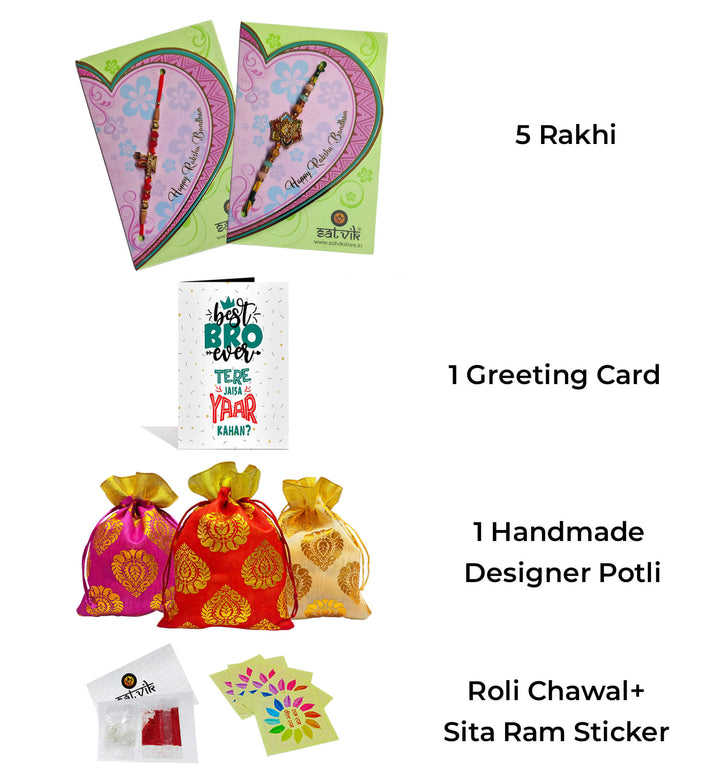 • Package: Set of 2 Rakhi with Tilak set ( Roli Chawal ) and Holy Soun ( Ram Sita Stickers), Greeting and Potli